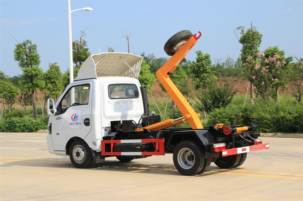 該款鉤臂式垃圾車由液壓系統、操作系統組成。舉升油制缸(1支)系國內知名液壓件廠家生產的雙作用油缸。垃圾廂可自吊上放下,可自行傾倒垃圾,上下一次工作循環時間≤50S。該車的特點是一個車能配多個垃圾廂,能實現一臺車與多個垃圾廂聯合作業,循環運輸,充分提高了車輛的運輸能力。